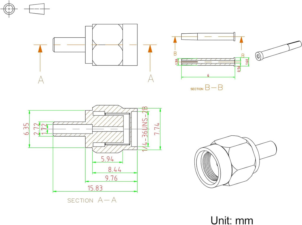 - Connector: RP-SMA male (inside threads with NO center pin); Termination: cable-crimp; Impedance: 50 ohms
