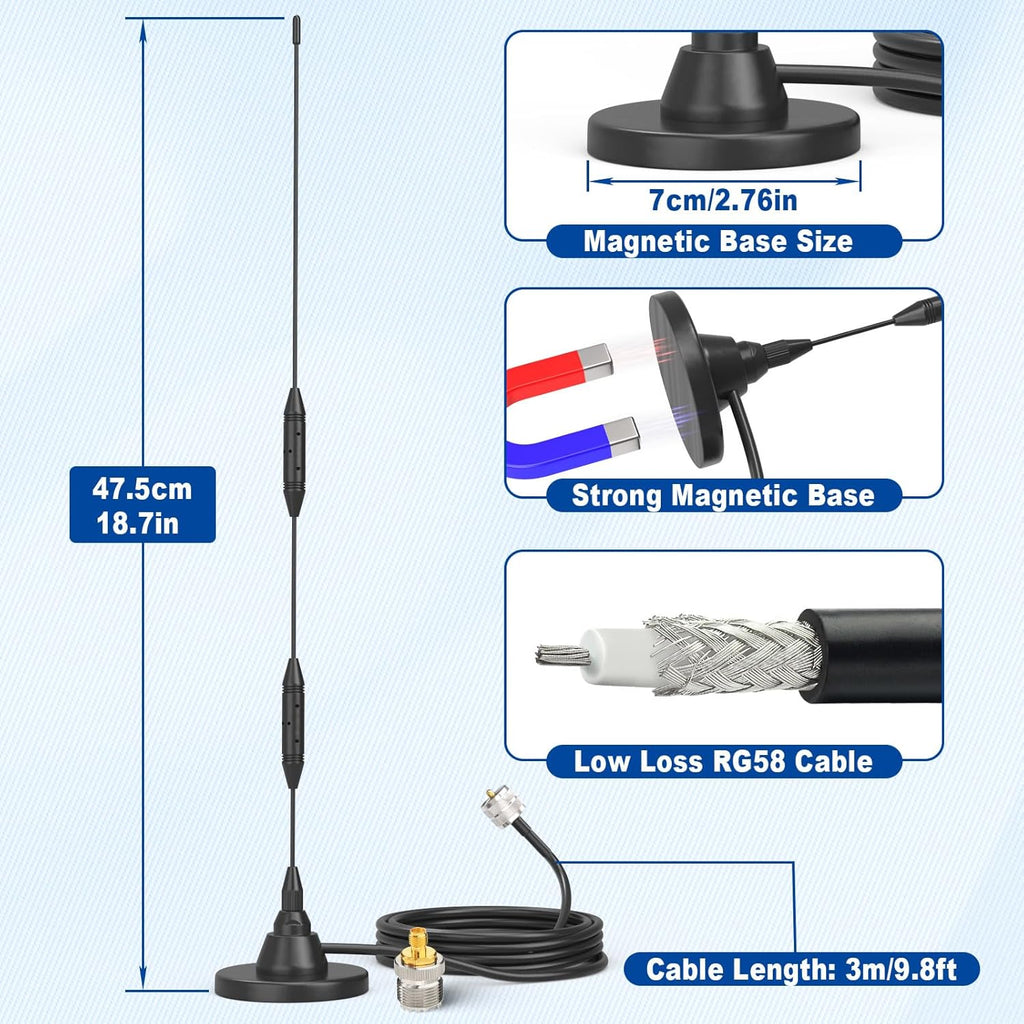 - Antenna Height: 47.5cm/18.7in; Mounting: the strong magnetic base can securely hold the antenna in place on a metal surface